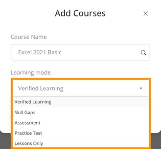 Select the appropriate learning mode from the dropdown menu, choosing from options including Verified Learning, Skill Gaps, Assessment, Practice Test, or Lessons Only.