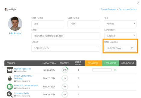 Expire Users Go to the Users tab. Find and click the user you want to expire. Click on the user’s name to open their profile and enter a past date in the User Expires field. Click Close when you’re finished.
