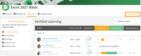 Export Course Users On the Course Page, go to the Users tab. Click Export User List in the top-right corner. A CSV file containing your user list will be automatically downloaded.