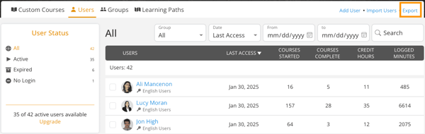 Export User Reports Go to the Users tab. In the top-right corner of the Users page, find and click on the Export button. A CSV file containing your user report will be automatically downloaded.