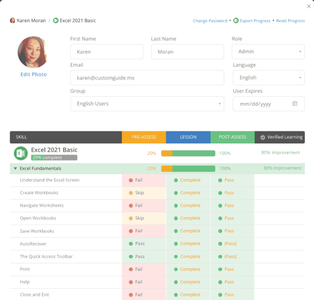 If you want to view a more detailed report, click on a user's name to see their pre-assessment, lesson, post-assessment, and improvement report.